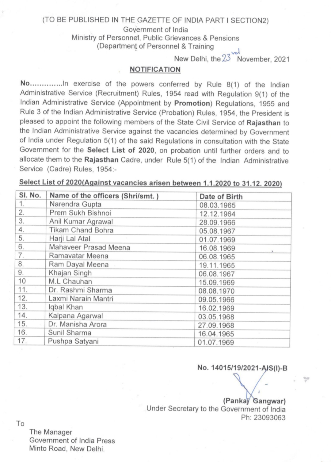 जयपुर। डीओपीटी ने नोटिफिकेशन जारी कर 2020 की IAS चयन सूची जारी की है। रामवतार मीना, नरेंद्र गुप्ता, प्रेमसुख बिश्नोई, अनिल कुमार अग्रवाल, टीकम चंद बोहरा, हरजी लाल अटल, महावीर प्रसाद मीणा, रामदयाल मीणा, खजान सिंह, एमएल चौहान, डॉ. रश्मि शर्मा, लक्ष्मीनारायण मंत्री, इकबाल खान, कल्पना अग्रवाल, डॉ. मनीषा अरोड़ा, सुनील शर्मा, पुष्पा सत्यानी इसी के साथ RAS अधिकारी से IAS बन गए हैं।