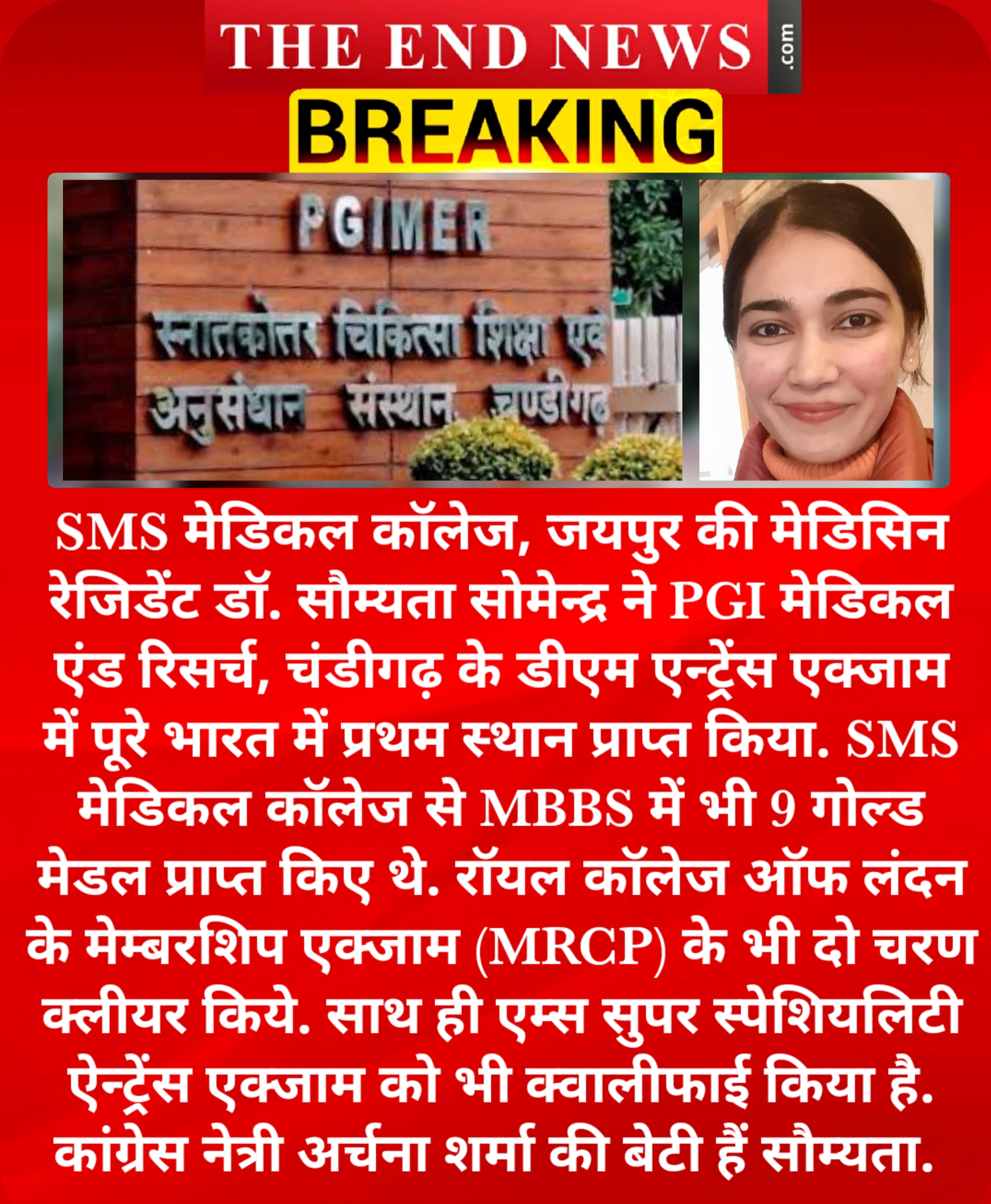 जयपुर. राजस्थान के सबसे बड़े सरकारी एसएमएस मेडिकल कॉलेज की मेडिसिन रेजिडेंट डॉक्टर सौम्यता सोमेन्द्र ने पीजीआई मेडिकल एन्ड रिसर्च, चंडीगढ़ के डीएम एंट्रेंस एक्जाम में पूरे भारत में प्रथम स्थान प्राप्त किया है. काबिलियत का अंदाजा इसी बात से लगाया जा सकता है कि एसएमएस मेडिकल कॉलेज से एमबीबीएस करने के दौरान भी सौम्यता ने 9 गोल्ड मेडल प्राप्त किए थे. सौम्यता ने रॉयल कॉलेज आॅफ लंदन के मेम्बरशिप एक्जाम (एमआरसीपी) के भी दो चरण क्लीयर किये हैं, साथ ही एम्स सुपर स्पेशियलिटी एंट्रेंस एक्जाम को भी क्वालीफाई किया है.