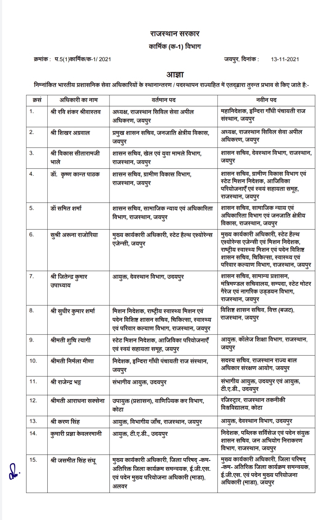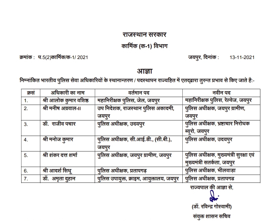 मंत्रिमंडल फेरबदल की चर्चाओं के बीच में देर रात राजस्थान की ब्यूरोक्रेसी में कई बड़े बदलाव किए गए। राज्य सरकार ने शनिवार देर रात 15 IAS, 7 IPS और 2 RAS अफसरों की तबादला लिस्ट जारी कर दी। इनमें उदयपुर और जयपुर ग्रामीण सहित चार जिलों के पुलिस अधीक्षक बदले गए हैं। IPS शंकरदत्त शर्मा को मुख्यमंत्री की सुरक्षा का जिम्मा सौंपा गया है।