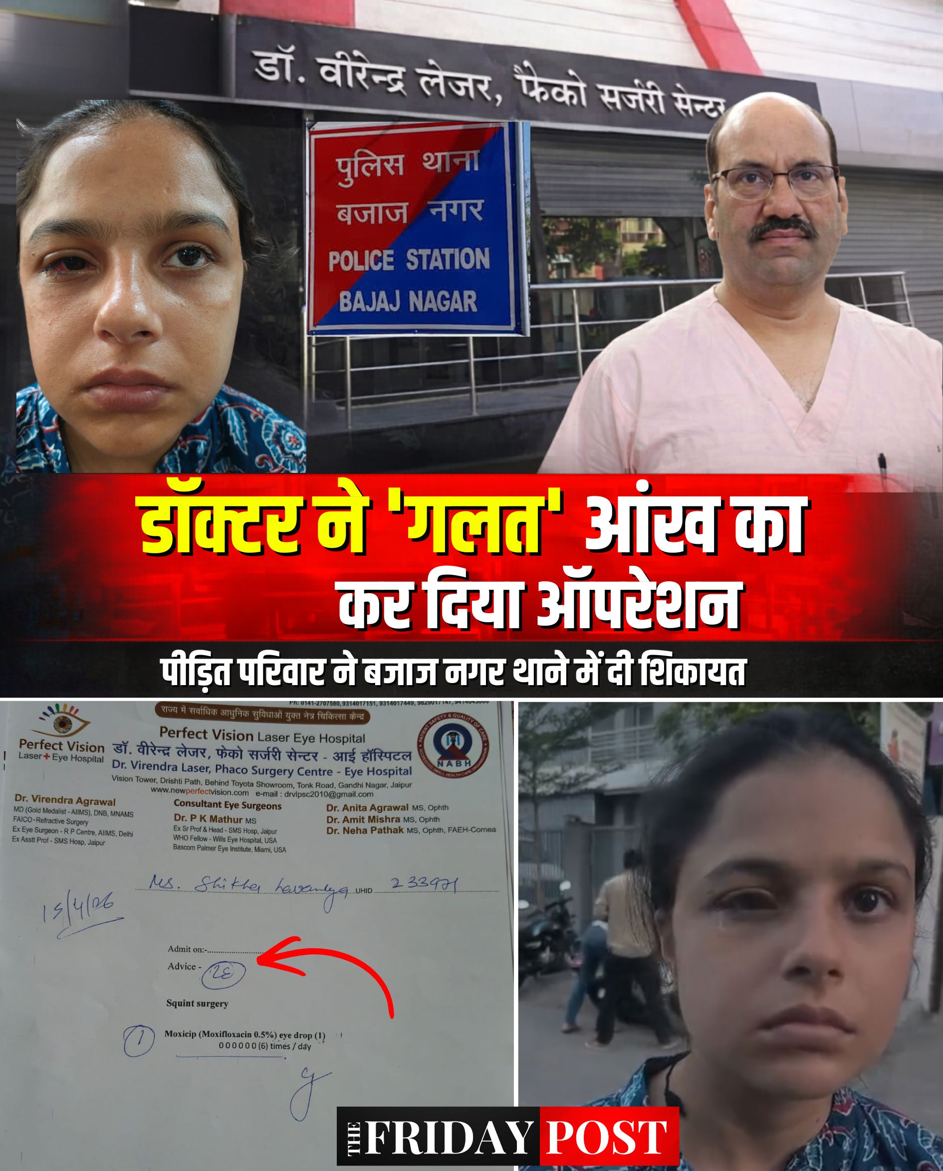 बजाज नगर के किसान मार्ग पर रहने वाले शिकायर्ता अरविंद लवानियां ने लिखा कि मेरी पुत्री शिखा लवानियां के उपचार के दौरान हुई गंभीर चिकित्सकीय लापरवाही के संबंध में बताना चाहता हूं कि मेरी पुत्री का इलाज डॉ. वीरेन्द्र लेजर आई हॉस्पिटल में जनवरी माह से चल रहा था। अस्पताल द्वारा जांच किए जाने पर, दाहिनी आंख में लेंस प्रत्यारोपित करने की सलाह दी गई, जिसके लिए मैंने 28/01/26 को अपनी बेटी को भर्ती कराया। डॉ. वीरेंद्र ने उनकी दाहिनी आंख की सर्जरी की और उन्हें अस्पताल से छुट्टी दे दी। उसे बाईं आंख के भेंगापन के इलाज के लिए बाद में आने को कहा गया था।