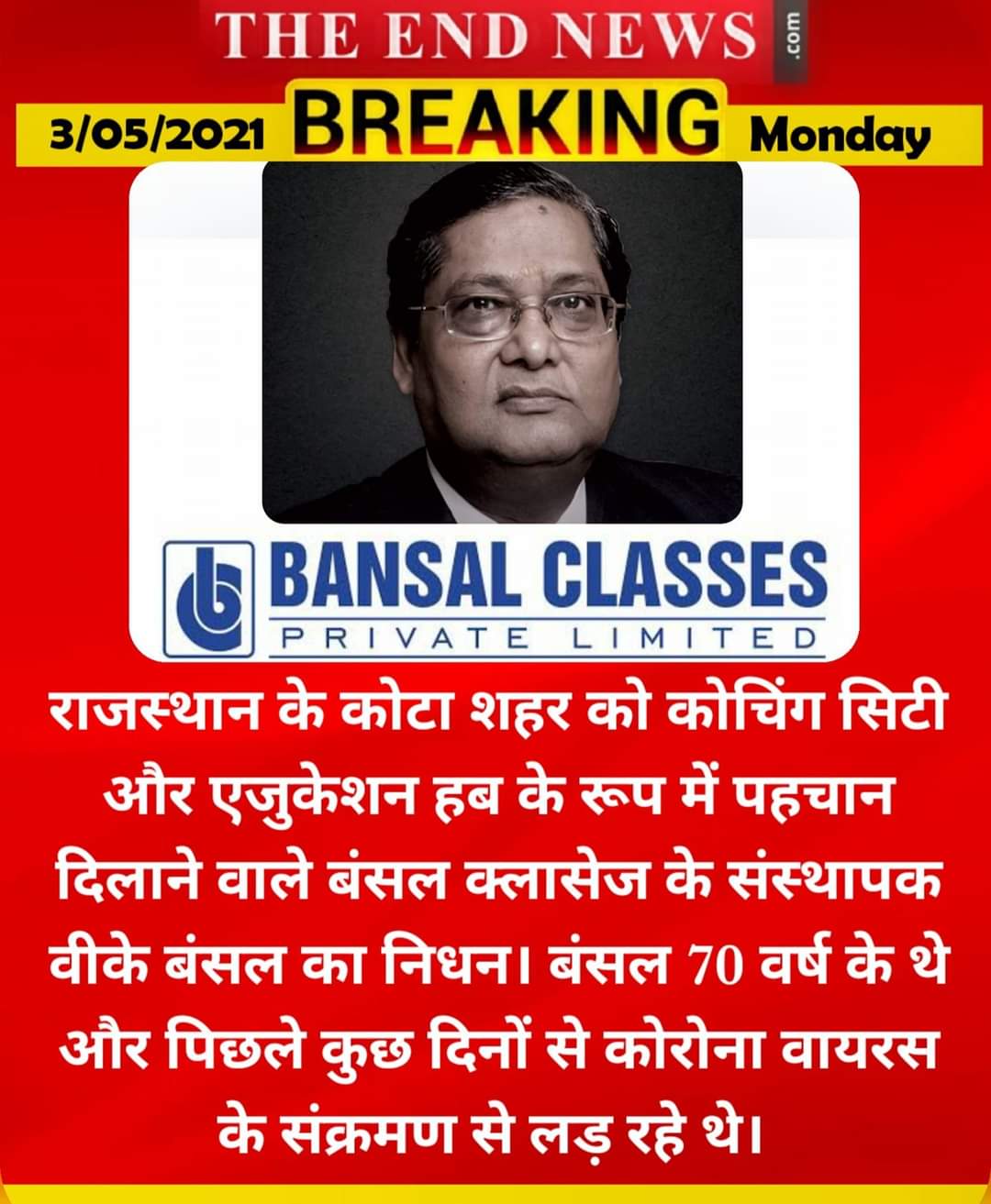 कोटा। देश को सैकड़ों आईआईटियंस देने वाले कोचिंग गुरु वीके बंसल ने दुनिया को अलविदा कह दिया है। वो पिछले दिनों कोरोना से संक्रमित हुए थे और उनका चिकित्सकों की देखरेख में इलाज भी चला, लेकिन उनकी तबीयत ज्यादा खराब होने के बाद आज उनका निधन हो गया।