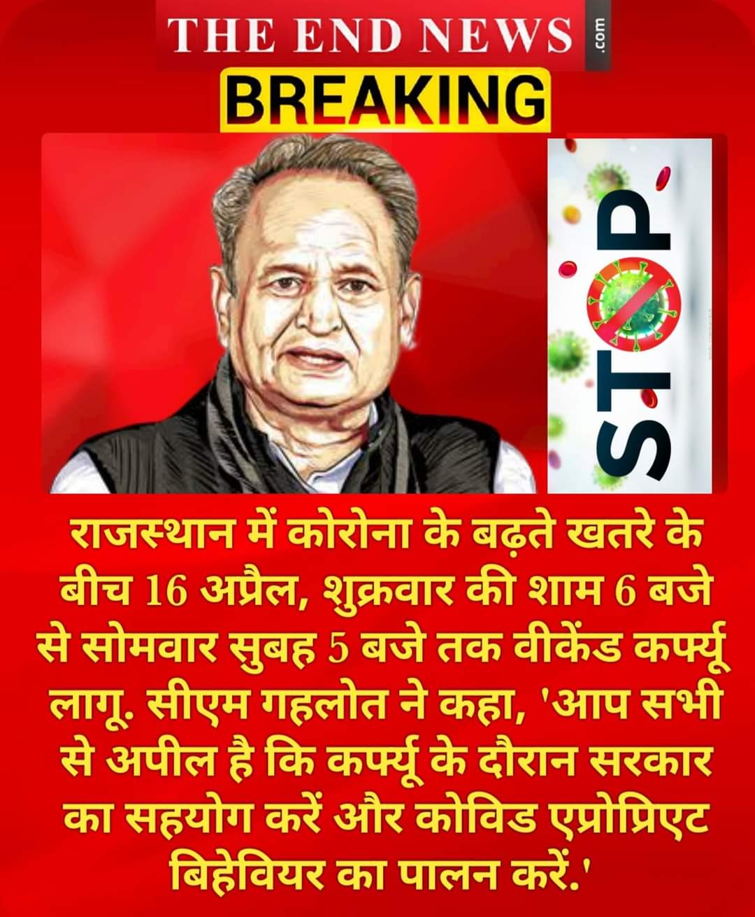 कर्फ्यू को लेकर CM ने कहा कि इस दौरान पहले से चल रहे नाइट कर्फ्यू में छूट की श्रेणी वाली सेवाओं में फल-सब्जी, दूध, एलपीजी और बैंकिग सेवाओं को भी शामिल किया गया है। पहले प्रदेश के 17 जिलों में कोरोना के अधिक मामले सामने आ रहे थे लेकिन पिछले कुछ दिनों में सभी जिलों में संक्रमण तेजी से फैला है। अब प्रदेश में कोरोना के 6,658 नए मामले और 33 मौते हुईं हैं। इसलिए आज वीकेंड कर्फ्यू का सख्त फैसला लिया गया है। अगर समय रहते कठोर कदम नहीं उठाए गए तो स्थिति दूसरे प्रदेशों जैसी विकट स्थिति बन सकती है। आमजन से अपील है कि पूर्व की तरह एकजुटता दिखाएं और एक-दूसरे का सहयोग करें। राजस्थान सरकार हर परिस्थिति से निपटने के लिए तैयार है।