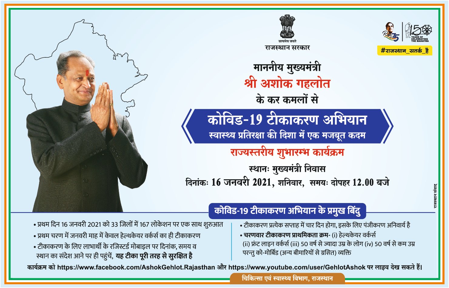 नई दिल्ली. भारत में 16 जनवरी को दुनिया का सबसे बड़ा टीकाकरण अभियान शुरू होगा. वीडियो कॉन्फ्रेंसिंग के माध्यम से वैक्सीनेशन कार्यक्रम की शुरुआत सुबह 11 बजे होगी. प्रधानमंत्री मोदी वीडियो कॉन्फ्रेंसिंग के जरिए इसकी शुरुआत करेंगे. देश के 3006 सेंटर पर एक साथ यह कार्यक्रम शुरू होगा. राजस्थान में मुख्यमंत्री अशोक गहलोत राज्य स्तरीय अभियान की वीडियो कॉन्फ्रेंसिंग के माध्यम से जयपुर से शुरुआत करेंगे. अभियान राजस्थान में 168 सेंटरों पर एक साथ शुरू होगा. जयपुर के एसएमएस अस्पताल में मुख्य वैक्सीनेशन सेंटर बनाया गया है.